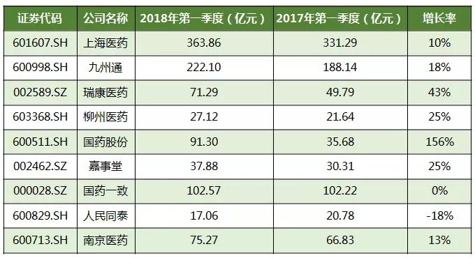 表1 醫(yī)藥商業(yè)流通上市企業(yè)2018年第一季度主營(yíng)業(yè)務(wù)收入同比增長(zhǎng)