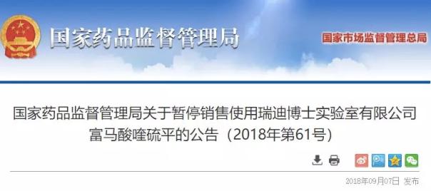9月7日,國家藥監局發布關于暫停銷售使用瑞迪博士實驗室有限公司富馬酸喹硫平的公告,要求各口岸食品藥品監督管理局暫停發放該產品的進口通關憑證。
